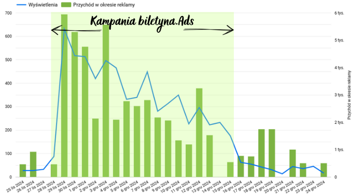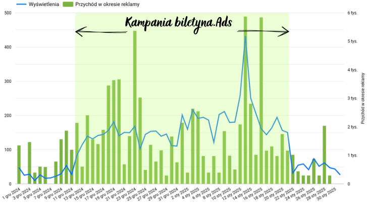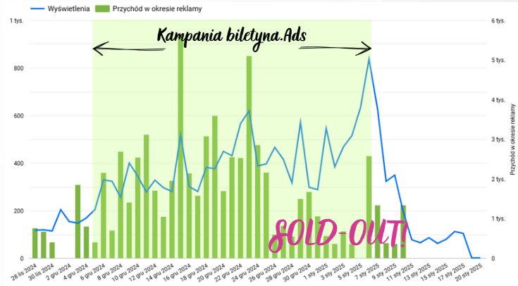 Impresariat jednego z najpopularniejszych kabaretów w Polsce zlecił kampanię biletyna.Ads w grudniu, licząc na to, że bilety będą świetnym pomysłem na prezent pod choinkę. Efekt? Sprzedaż ruszyła jak lawina - pierwsza kampania wyczerpała pulę budżetu w ekspresowym tempie, dlatego Organizator zdecydował się na jej przedłużenie w styczniu.